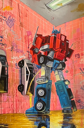 Growing up during the final frost of the Cold War, there was a hum of dread underneath everything—a buzzing awareness that we were all one bad decision away from nuclear lights-out. That paranoia seeped into my worldview and still bleeds into my work. I’m drawn to contrasts: bold, bright colors wrapped around dark ideas. Smiling faces mid-catastrophe. Pop icons dropped into political nightmares. I don’t mock the darkness—I just force it to wear a clown nose.